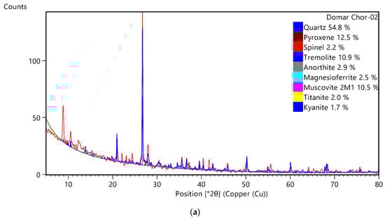 According to the results of the X-ray diffractogram (XRD) analysis, all samples were found to be quartz-rich (>55%). The minor constituents were biotite, enstatite, pargasite, muscovite, sodalite, diopside, magnesite, pyroxen, spinel, tremolite, anorthite, magnesioferrite, titanite, kyanite, periclass, and spodumene. According to the XRD results, the heavy minerals (HM) such as sillimanite, garnet (almandine), zircon, rutile, ilmenite, xenotime, monazite, and kyanite, as well as other minerals from the amphibole and pyroxene group, were found in the HM concentrates made from the bulk sediments. There are numerous distinct minerals, and many of them have overlapping peaks, making it difficult to distinguish them using the XRD method. Enstatite is the primary mineral that can be seen at the magnetic part’s maximum intensity, along with biotite, pargasite, muscovite, sodalite, diopside, magnesite, pyroxen, spinel, tremolite, anorthite, magnesioferrite, titanite, kyanite, periclass, spodumene, hornblende, almandine, and monazite, all show in Figure 3a,b and supplementary Figure S1a–c. The auto-matching data from the X’Pert High Score Plus’ software of the XRD system and the X-ray diffractometer (Smartlab SE, Rigaku, Japan) were used for the digital data interpretation.
