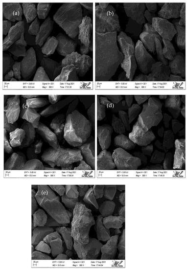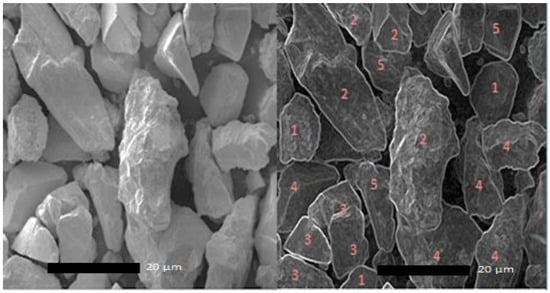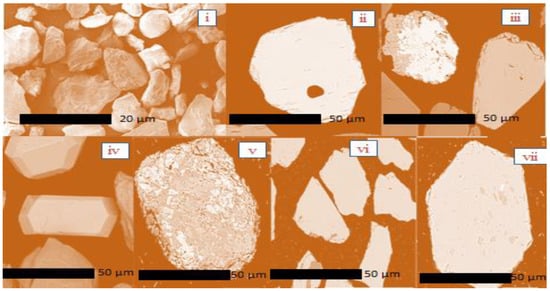 For rechecking, cross-checking, or the verification of the heavy metal concentrations, we have applied the XRD, WD-XRF and SEM techniques. The grain size distributions were calculated from the SEM images of the refined grain mounts. Various minerals have been identified from the elemental settings. According to Table 3, ilmenite, zircon, garnet, rutile, and magnetite have been shown as individual sand grains. Each SEM (Figure 4) was subsampled for these fractions. Epoxy resin and refined oil were used in the SEM analysis when the grains were mounted. The scale on the SEM image was used to calibrate the software. Prior to processing through SEM Image, the analyzed particles (the grain size of each density fraction) function was used for measurement. The images were collected at a magnification to capture over five hundred grains per image. A magnification of 500X was used, and circularity was set to 0.0–1.0.