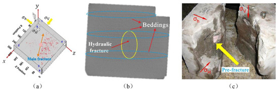 Indoor physical simulation experiments [11,61,69,71,72] are commonly used to study hydraulic fracturing operations in shale reservoirs by simplifying the subsurface situation and selecting materials with similar properties to shale or directly using the shale of the target layer to perform hydraulic fracturing experiments indoors using a true triaxial device (Figure 1) and combining acoustic emission monitoring, high-energy CT scanning, and post-compaction fracture morphology observation auxiliary techniques (Figure 2) was used to study the propagation process of hydraulic fractures during hydraulic fracturing in detail to understand the propagation mechanism of hydraulic fractures.