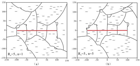 Two-dimensional discrete element model simulates the intersection of multi-stage fractured hydraulic fractures with natural fractures in horizontal wells, hydraulic fracture pattern for a sequential injection from left to right in the presence of 100 randomly located natural fractures with a 10 m initial length. There were 5 injection points, located at x = −100, −50, 0, 50 and 100 m and y = 0 m. The figure shows a bedding plane (map) view of the fracture geometry, and the fractures are confined to an elastic layer with a 30 m thickness. Both simulations were run with a relative net pressure of Rn = 5, but with different propagation velocity exponents—(a) n = 1, (b) n = 5 [52].