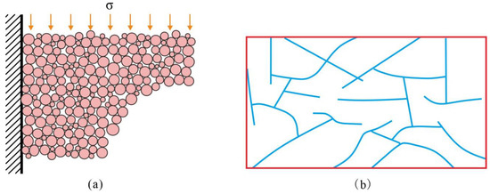 The discrete element method was originally proposed by Cundall as a numerical calculation method based on the mechanics of discontinuous media [102,103,104]. The basic idea of this method [2,13,14,105,106] is to discretize the object of study into rigid blocks: each rigid block follows Newton’s second law; each rigid block is connected by contact; the interaction between the rigid blocks is described by using the display difference method; the discontinuous units formed between different rigid blocks can be used to describe weak surface structures, such as cracks and laminar surfaces; and the discontinuous units between the channels formed between the discontinuous cells allow for fluid flow, thus solving the fluid–solid coupling problem (Figure 6a). The discrete element method has been introduced by researchers to study the mechanism of hydraulic fracture extension because of its greater advantage in dealing with discontinuous structures, such as natural fractures and laminated surfaces [13,14,17,106,107].