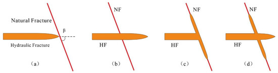 Results of the interaction between hydraulic cracks and natural cracks [117]: (a) Cut-off, (b) Penetration, (c) Deflection, (d) Bifurcate.