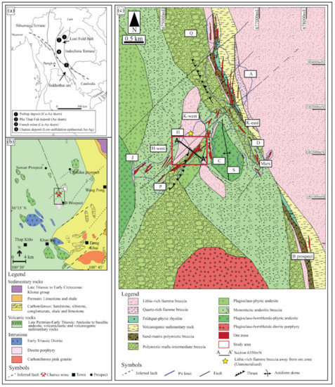 (a) Tectonic framework of Thailand and the surrounding regions, with locations of major Cu-Au deposits along the Loei Fold Belt. (b) District-scale geology of the Chatree deposit area. (c) Geological map of the Chatree deposit and the surrounding areas showing dominant volcanic and volcanogenic sedimentary rocks. The Chatree deposit has several pits, such as Q, A, K-west, K-east, H, C, H-west, J, P, D, S, and Mars pits. Data are modified after Salam [30]. The study focused on section 6350 mN and the lithic-rich fiamme breccia sample (background sample) collected away from the ore zone (yellow star).