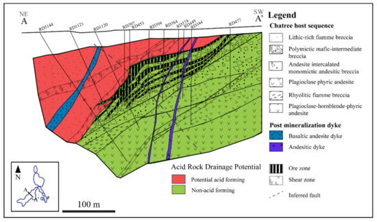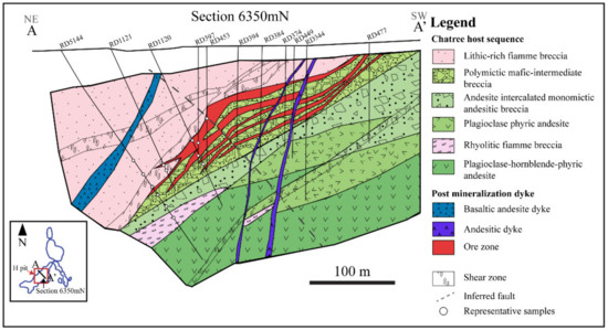The representative geological cross section of the H-pit along A-A’ (section no. 6530 mN) showing all rock types of the host sequence and ore zone. Note that the ore zone and rocks of the host rock sequence are often cross-cut by post-mineralization basaltic andesite and andesite dykes. Data modified after [30].