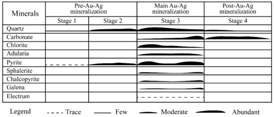 The ore zone of the H ore lens occurs as a narrow zone at the surface, sprays into several layers at the middle part, forming a wide ore zone, and again becomes a narrow zone and pinches out at the deeper part (Figure 2). The ore zone is represented by Au-Ag mineralization, which occurs mainly as veins/veinlets with minor breccia. They are predominantly hosted in the polymictic mafic-intermediate breccia unit. Based on cross-cutting and overprinting relationships, mineral assemblages, and textural features of veins/veinlets and breccias, at least four mineralization stages are identified at the H ore lens with a main Au-Ag bearing event at stage 3 (Figure 4).