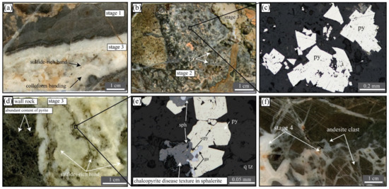 Stage 1 (quartz ± pyrite vein) is characterized by light to dark gray microcrystalline quartz with rare pyrite (Figure 5a). It commonly occurs as vein, stockwork, and minor breccia. Pyrite is rare, but where present, it appears as fine-grained pyrite aggregates situated along the edges of veins as a black band. Stage 2 forms a pyrite-rich quartz vein (Figure 5b) and is characterized by light gray quartz, with abundant pyrite presenting as patches in the vein. Sulfide minerals in stage 2 consist mainly of pyrite-forming aggregates of subhedral to euhedral crystals (Figure 5c). No gold has been identified at this stage. Stage 3 is the main Au-Ag mineralization stage of the H ore lens and is represented by a quartz-carbonate-chlorite-sulfide-electrum vein (Figure 5d). It is characterized by colloform vein textures. The veins at this stage consist of white to pale gray quartz with chlorite and sulfide-rich bands (Figure 5d). Sulfides at this stage comprise assemblages of pyrite and minor sphalerite, chalcopyrite, and galena (Figure 5e). Pyrite is subhedral to euhedral in shape and associates intimately with other sulfides (e.g., sphalerite, galena, chalcopyrite). Chalcopyrite tends to form as a very fine-grained dissemination in sphalerite crystals (i.e., chalcopyrite disease texture). The pyrite in the vein commonly has a larger size than pyrite in host rock (up to 300 µm; Figure 5e). Gold occurs as an electrum and generally forms free grains associated with quartz, calcite, and sulfide minerals. The electrum is also quite common to form as inclusions of sulfides, especially pyrite. It was observed that a high concentration of disseminated pyrite is present in the wall rock of the hanging wall zone in proximity to the stage 3 veins (Figure 5d; up to a few tens cm from veins). Stage 4 occurs as quartz-carbonate veins/veinlets and is characterized by white quartz on the edge of the veins or envelopes of breccia fragments in the veins, while white to pinkish-white carbonate occurs in the inner part of the veins (Figure 5f). The stage 4 veins contain no gold or sulfide minerals and are widely distributed across the H ore lens area and cross-cut veins of all earlier stages.