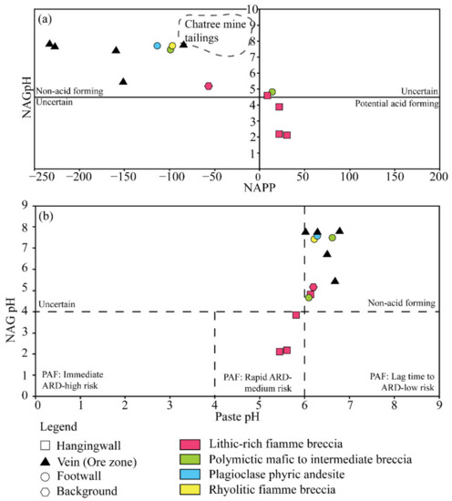 The results of this study can provide an idea to estimate the volume of PAF rocks in the hanging wall zone. It is assumed that the spatial distribution of the lithic-rich fiamme breccia containing abundant disseminated sulfides (indicated PAF) is limited to less than a few hundred meters from the ore zone. A background sample of the lithic-rich fiamme breccia unit collected approximately 300 m from the ore zone is determined by NAF rock. It is a rough idea to draw a boundary between PAF and NAF rocks in the lithic-rich fiamme breccia unit. Further study with a closely-spaced sampling of the unit will provide data to estimate a more accurate and precise volume of PAF rocks. In addition, our test results imply that samples can be independently assessed using either of the guidelines for >0 in NAPP value, <4 in NAGpH value, or <6 in paste pH value to discriminate the PAF from NAF materials (Figure 7). This is because plots of the lithic-rich fiamme breccia of the hanging wall zone have a linear trend in Figure 7a,b. Thus, either method can provide a preliminary test result to judge whether the tested material can be of PAF. This can reduce time and costs before conducting a further detailed investigation.