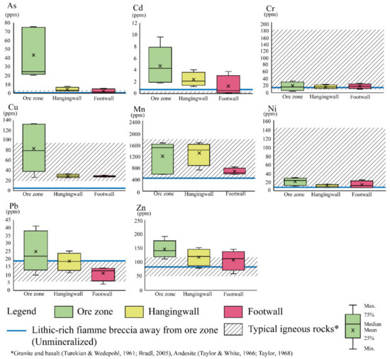 The trace element contents in the samples of the ore, hanging wall and footwall zones, and background area from the H ore lens are summarized and compared using box and whisker plots (Figure 9) with typical values of igneous rocks (granite, andesite, and basalt) [43,44,45,46]. The compared data indicate that all of the tested metals (e.g., As, Cd, Cu, Mn, Pb, and Zn) are elevated in the vein samples from the ore zone compared to the hanging wall and footwall zone samples, except Cr, and Ni, which seem to be concentrated in similar mean values and value ranges. In addition, some elements, including Mn and Pb, are recognized in the hanging wall zone compared to the footwall zone. As Cu, Mn, and Zn are more enriched in the hanging wall and footwall zones at the H ore lens compared with the background sample. Cr and Ni values in the background sample are similar to the values of the hanging wall and footwall zones, whereas Pb content in the unmineralized sample is almost similar to the ore and hanging wall zones and higher than the footwall zone. The correlations of the results in this study with typical values of igneous rocks indicate that the metals and metalloids exceeding the typical igneous rock, which should be concerned in each zone are: (1) Ore zone consisting of As, Cd, Cu, Pb, and Zn; (2) Hanging wall zone comprising As, Cd, Pb, and Zn; (3) Footwall zone consisting of Cd, and Zn. However, As in the footwall only presents polymictic mafic-intermediate breccias (ore-hosted rock).