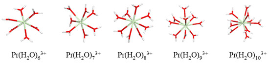 Qiu et al. [17,24,25] studied the hydration numbers of hydrated La3+, Y3+ and Lu3+ ions and found that the most stable hydrated structures of those RE ions have 9–10 H2O ligands. Hence, Pr3+ coordination numbers larger than six were studied. Figure 1 shows the equilibrium geometric structure of Pr(H2O)6−103+. It was found that Pr3+ is connected with H2O molecules by covalent bonds. The hydrate maintains a high symmetry when the number of H2O molecules is six, whereas the space around Pr3+ becomes more crowded with the increase in the number of H2O ligands.
