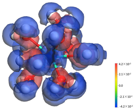The Mulliken charge population and difference charge density of [Pr(H2O)10]3+ are shown in Table 2 and Figure 2. Compared with a Pr(III) ion, the charge of hydrated Pr decreases from +3 to +2.13, that is, Pr loses a total of 2.13 electrons; specifically, the 2s, 2p, 5d and 4f orbitals obtain 0.13 and lose 0.29, 0.17 and 1.81 electrons, respectively. As a result, the coordinated O of H2O gains electrons overall, with a charge between −0.92 and 0.99, that maybe due to the electron density lowering of the adjacent H atoms and Pr atom. Figure 2 shows the difference charge density of [Pr(H2O)10]3+; the red area represents the gain of the electrons, and the blue area represents the loss of the electrons. It is obvious that the H atoms are surrounded by blue areas because they are attracted by the electronegative O atom; hence, the O atom is surrounded by a red area. There is also a blue area in the periphery of Pr, which is consistent with the results in Table 2.
