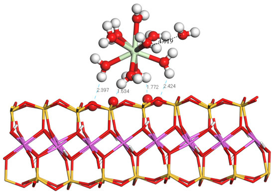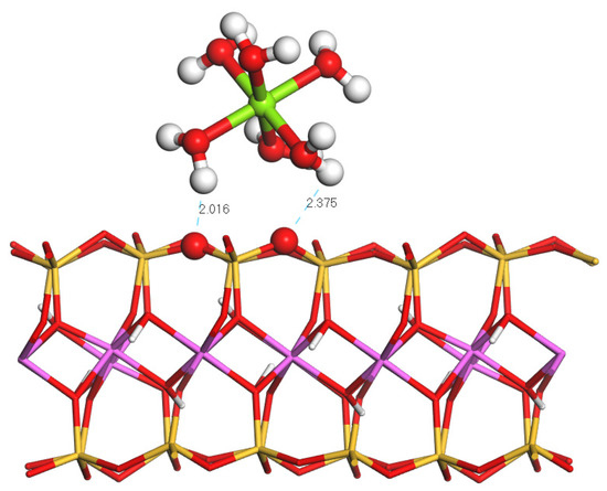 A previous work [26] revealed that the most stable structure of hydrated Mg2+ is [Mg(H2O)6]2+, which was used as the initial adsorption structure in this article. Table 5 shows the equilibrium geometry of [Mg(H2O)6]2+ after the adsorption on the montmorillonite (001) surface, which is similar to the adsorption of hydrated Pr ions. As shown in Figure 5, two hydrogen bonds form between the hydrogen of H2O ligands and oxygen of the surface, with lengths of 2.016 and 2.375 Å, respectively, so that the hydrated Mg complex can be stably adsorbed on the (001) surface of Mt. According to the structural parameters and adsorption energy of [Mg(H2O)6]2+ before and after the adsorption (Table 5), the bond length of Pr-Ow increases from 2.26 Å before the adsorption to 2.40 Å due to the steric hindrance. Because of the lower number of H2O ligands in [Mg(H2O)6]2+ than in [Pr(H2O)n]3+, no H2O ligands escape from the first hydration layer of Mg2+ ions after the adsorption.