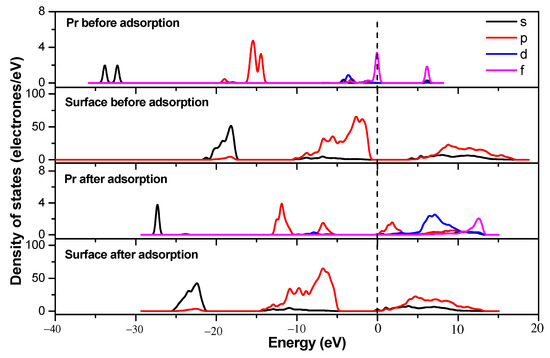 The partial densities of states (PDOSs) of Pr and the (001) surface before and after adsorption are shown in Figure 4. The 4f orbital of Pr is sharp and thin near the Fermi level before the adsorption, indicating that the 4f orbital is very active because 4f belongs to the valence electron orbital of Pr, which easily gains and loses electrons. However, the 5d and 6p orbitals are in the inner layer, and the activity is lower, hence, their PDOS is far from the Fermi level. Similarly, the 2p orbital of the (001) surface is also near the Fermi level before the adsorption. Notable changes occur after the adsorption, with the 4f orbital of the Pr atom shifting towards a higher energy, which is far from the Fermi level, while the energy of the (001) surface decreases to maintain the stability of the system. Additionally, the energy scope of the Pr 4f orbital expands to 11.2–14 eV, implying that the non-locality of the Pr 4f orbital is increased, which may be beneficial for bonding. According to the Mulliken charge of Pr (Table 4), following the adsorption, the Pr 4f orbital loses 0.15 e, while the 6s and 5d orbitals lose 0.02 e and 0.06 e, respectively. The total charge of Pr increases obviously from 2.28 to 2.52. A large number of electron transfers lead to the peak shape of the density of states of the Pr atoms to change significantly.