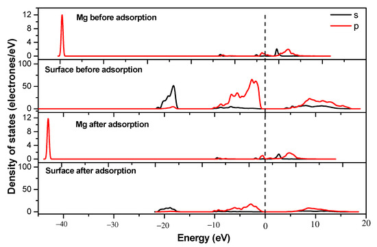 PDOS of Mg and (001) surface of Mt before and after adsorption.