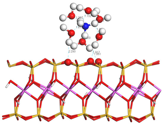 Different from Mg2+, NH4+ interacts with H2O ligands through hydrogen bonds; in simulations, the coordination number of NH4+ was found to be approximately five [27,28], whereas the experiments indicated that the coordination number is larger [29]. Hence, the coordination number of NH4+ was chosen to be six, which is beneficial for a comparison with Mg2+. The equilibrium geometry of hydrated NH4+ after the adsorption is shown in Figure 7. Although there were no coordination bonds between the NH4+ ion and H2O, several hydrogen bonds formed. The hydrogen bonds were very short, with lengths ranging from 1.207 Å to 1.943 Å, indicating a strong interaction between the NH4+ ion and H2O ligands. In addition, three hydrogen bonds formed between the H2O ligands and surface O, with an adsorption energy of −188 kJ/mol. This adsorption energy is more positive than that of [Mg(H2O)6]2+, indicating that the adsorption stability of [Mg(H2O)6]2+ is higher than that of the hydrated NH4+ ion, that is, the desorption efficiency of [Mg(H2O)6]2+ for RE ions is stronger than that of the hydrated NH4+ ion. Similar to [Mg(H2O)6]2+, the adsorption energy of the hydrated NH4+ ion is much lower than that of [Pr(H2O)10]3+ (−1182 kJ/mol). Hence, it is difficult to thermodynamically desorb Pr3+ ions from Mt by NH4+ ions.