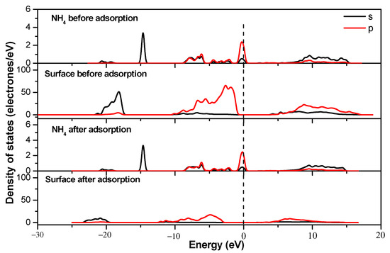 The PDOSs of NH4+ and the (001) surface before and after the adsorption are shown in Figure 8. Since there were no coordination bonds between the NH4+ ion and H2O, the PDOS of the NH4+ ion showed almost no change after the adsorption. In contrast, the PDOS of the surface shifted towards the lower energy direction, and its 2s and 2p orbitals were obviously far away from the Fermi level. The change in PDOS indicated that the system became more stable after the adsorption. The Mulliken charge of N is listed in Table 7. Similar to the slight change in the PDOS, the electron transfer of the N atom was very low, and its 2s and 2p orbitals only obtained 0.01 e and 0.05 e, respectively. The N atom obtained 0.06 e, and the charge decreased from −0.79 to −0.81 after the adsorption.