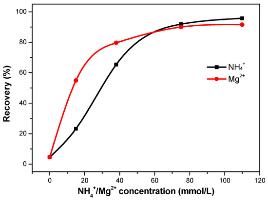 A series of desorption experiments were carried out to verify the DFT calculation result that the desorption efficiencies of Mg2+ are higher than those of NH4+. Raw Mt was mixed with a chloride praseodymium solution to obtain Pr–Mt, which was used in the desorption process. Figure 9 shows the recovery of Pr3+ from Mt as a function of the NH4+/Mg2+ concentration. The recoveries of Pr3+ were 55% and 80%, while the concentrations of Mg2+ were 15 mmol/L and 38 mmol/L, respectively, which were much higher than those of NH4+ (23% and 65%), whereas the desorption efficiencies of NH4+ and Mg2+ were equal under high concentrations. The concentrations of NH4+, Mg2+ and Pr3+ in lixivium are listed in Table 8. The concentration of Pr3+ was only 1.64 mmol/L (with a recovery of 55%), while the concentration of Mg2+ was 15 mmol/L, which was nearly ten times larger than that of Pr3+. Additionally, the concentration of NH4+ was forty times larger than that of Pr3+, while the recovery was 95%. These results imply that the desorption efficiency of Mg2+ is higher than that of NH4+ and that the concentration of NH4+/Mg2+ should be much higher than that of Pr3+ in the desorption process, which is consistent with the DFT calculation result that the adsorption stability of hydrated magnesium ions is higher than that of hydrated NH4+, which is lower than that of Pr3+.