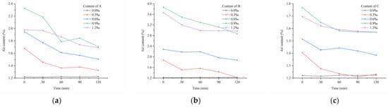 The results for the same group of slurries are as shown in Figure 5a–c: the air content in the slurry gradually decreases with time. When the amount of AEA is 0.9‰, comparing the air content of the slurry at 0 min, the air content of A is 73.3%, 74% for B, and 88.8% for C at 120 min. The reason for this could be that some of the tiny air bubbles mixed in the slurry floated to the top and burst [52,53]. Other small bubbles merge into large bubbles. When the bubble wall is very thin, it will burst directly into the slurry. Thus, the air content will decrease with time [37].