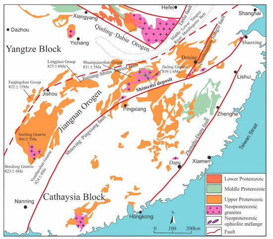 - Zhou, J.C.; Wang, X.L.; Qiu, J.S. The Neoproterozoic Tectonic-Magmatic Evolution of the Jiangnan Orogen Belt; Science Press: Beijing, China, 2014. (In Chinese) [Google Scholar]
