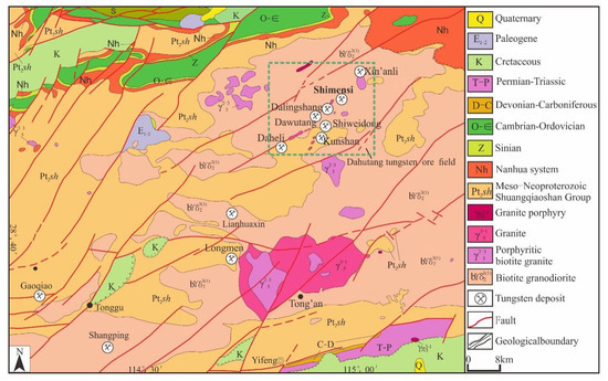 Neoproterozoic and Mesozoic granitic rocks are well-developed in the area. The Neoproterozoic biotite granodiorite, distributed approximately E–W-trending, is part of the Jiuling granodiorite batholith, the largest granitoid complex in SE China (outcrop size >2500 km2) [32]. The batholite granodiorite was zircon LA-ICP-MS and SHRIMP U-Pb dated to be ca. 820 Ma [11,14,32,33] and intruded the Shuangqiaoshan Group. It is peraluminous and characterized by high CaO/Na2O, and low Rb/Sr and Rb/Ba ratios, and has Sr-Nd isotopes similar to those of the Shuangqiaoshan Group [33]. The Mesozoic granitic rocks, predominately consisting of porphyritic biotite granite, fine-grained biotite granite and granite porphyry, intruded in both the Neoproterozoic biotite granodiorite and Shuangqiaoshan Group, and show a close relationship with the W mineralization [7,8,9,10,34]. The overall NE–ENE-trending faults cut the Neoproterozoic strata and biotite granodiorite, and controlled the distribution of both granite emplacement and W-polymetallic mineralization. A total of 15 W-polymetallic deposits are present in the ore field (size: 20 × 10km), among which five are medium to (super-)large in size, i.e., the Shimensi, Dongdouya, Dalingshang, Shiweidong and Kunshan (Figure 2).