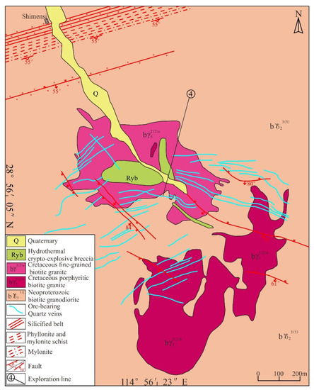 Three types of mineralization can be identified at Shimensi, i.e., veinlet-disseminated, hydrothermal crypto-explosive breccia and quartz vein, which commonly coexist spatially and overlap one another (Figure 4 and Figure 5). The veinlet-disseminated orebodies, accounting for over 90% of the W reserve, are distributed in the Neoproterozoic biotite granodiorite and Mesozoic granitic rocks (Figure 5a,b), especially in their exo-contact zone. The ore minerals are mainly scheelite with minor wolframite and chalcopyrite, which intergrow with some sulfides, including molybdenite, pyrrhotite, arsenopyrite, bornite, sphalerite, pyrite, enargite and tennantite. Major non-metallic minerals include quartz, biotite, muscovite, K-feldspar, dolomite and fluorite [22]. Alteration is closely related to wall rock lithology: K-feldspar is present in the contact zone close to the Mesozoic porphyritic biotite granite, whereas biotite is present close to Neoproterozoic biotite granodiorite. Greisenization and chlorite were developed in both the endo- and exo-contacts.