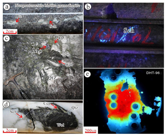 Photos of the representative rocks and ores obtained from the Shimensi deposit: (a,b) veinlet-disseminated scheelite in Neoproterozoic biotite granodiorite; (c) mineralization in hydrothermal crypto-explosive breccia; (d) scheelite and wolframite in quartz veins, wolframite cut by nearly parallel scheelite veins; (e) CL image of veinlet-disseminated scheelite. Qtz = quartz, Sch = scheelite, Cpy = chalcopyrite, Wol = wolframite, Mo = molybdenite.