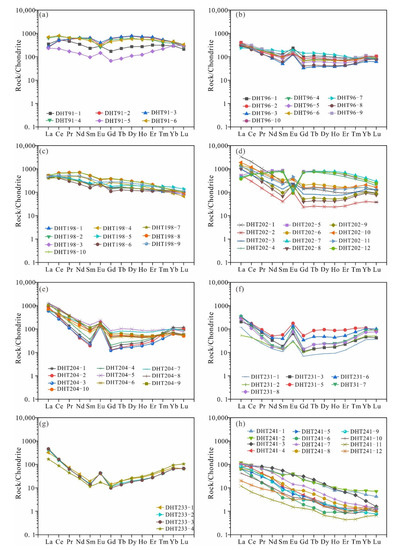 Chondrite-normalized REE patterns of scheelite from the Shimensi deposit: (a) DHT91; (b) DHT96; (c) DHT198; (d) DHT202; (e) DHT204; (f) DHT231; (g) DHT233; (h) DHT241. Data of (d–g) are adapted from [19]. Normalizing values are from Sun and McDonough [38].