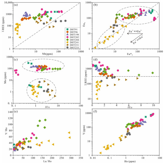 Plots of (a) Nb vs. ΣREE, showing no positive correlation for most of the scheelite samples; (b) chondrite-normalized EuN vs. calculated Eu*N values for scheelite (Eu*N = (SmN × GdN)1/2), showing that the majority of the spots are distributed along a horizontal line, while DHT141 shows positive EuN vs. Eu*N correlation; (c) δEu vs. Mo, showing that scheelite Mo content significantly decreases from the early to the late stage; (d) δEu vs. ΣREE, showing that the samples can be divided into two groups by ΣREE; (e) La/Ho vs. Y/Ho, showing similar trends for most of the samples (except DHT-141); (f) Ho vs. Y, showing that most of the samples have positive Ho vs. Y correlation.