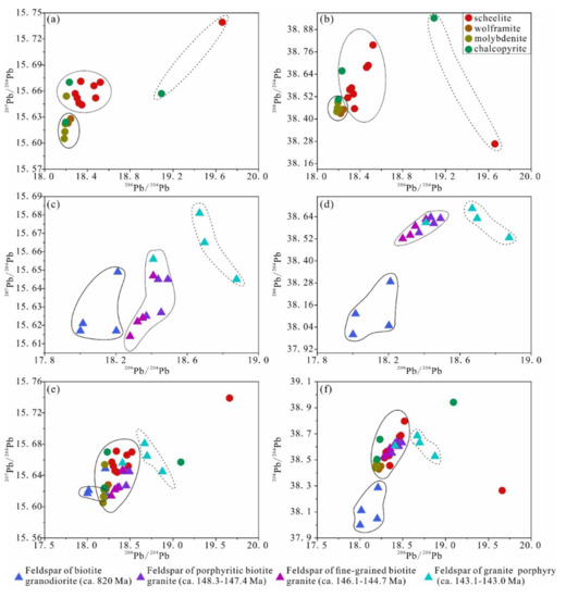 Plots of Pb isotope compositions of the (a,b) ore minerals (scheelite, wolframite, molybdenite and chalcopyrite) obtained from the Shimensi deposit; (c,d) feldspar obtained from the Neoproterozoic biotite granodiorite and Mesozoic granites at Shimensi; (e,f) ore minerals, the Neoproterozoic biotite granodiorite and Mesozoic granites at Shimensi. (Modified after [48]).