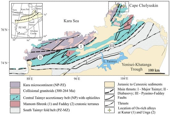 - Vernikovsky, V.A. Geodynamic Evolution of the Taimyr Folded Region; Publishing House of SB RAS, SRC UIGGM: Novosibirsk, Russia, 1996; p. 203. (In Russian) [Google Scholar]