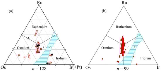 (a) Composition of Ru-Os-Ir alloys in the ternary diagrams Ru–Os–Ir(+Pt) from Kunar (open triangles, this study) and Unga (open circles, this study); (b) composition of Ru-Os-Ir alloys in the ternary diagram Ru–Os–Ir from Unga (data from []). Numbers 1 and 2 correspond to rutheniridosmine and miscibility gap, respectively (after nomenclature of Harris and Cabri []).