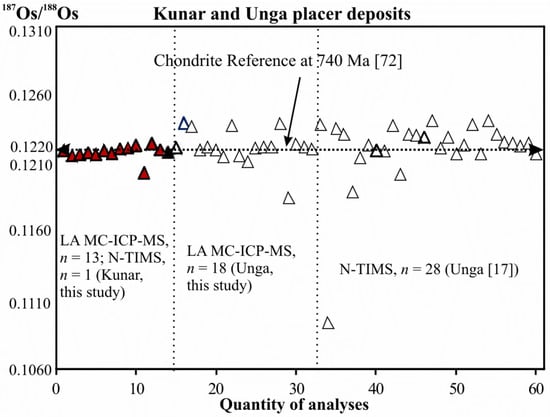 The average initial 187Os/188Os value of the Ru-Os-Ir alloys at Kunar and Unga are indicative of derivation from a source that evolved with a long-term chondritic Re/Os ratio. This conclusion is in good agreement with the previous Re-Os studies of PGM associated with dunite–harzburgite and clinopyroxenite–dunite massifs [,,,,,,,,,,,,,,,,,,,,,], indicating that PGM were formed in and derived from the ultramafic rocks of the massifs.