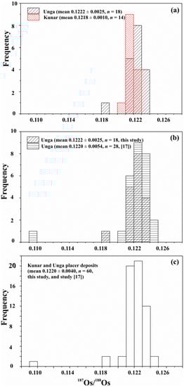 Histogram of Os isotopic compositions of the Ru-Os-Ir alloys from (a) Kunar and Unga (this study, n = 32), (b) Unga (LA MC-ICP-MS data from this study and N-TIMS data from [], n = 46), and (c) Kunar and Unga (data from this and [] studies, n = 60).