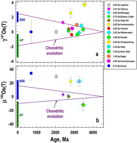 (a) Initial 187Os/188Os isotopic compositions, expressed as γ187Os, of mafic–ultramafic rocks plotted as a function of age. The data for the Archean-Proterozoic komatiites are from Puchtel et al. [,,,,,,,,,,,]. The Kunar data are from this study and represent an average of all analyses (2SD). The data for chondritic meteorites are compiled from Walker et al. [] and Fischer-Gödde et al. []. The Bulk Silicate Earth (BSE) value is from Meisel et al. [] and Day et al. []. The abyssal peridotite (AP) data are from Snow and Reisberg [], Brandon et al. [], and Day et al. []. (b). Initial 186Os/188Os isotopic compositions, expressed as µ186Os, of mafic–ultramafic rocks, plotted as a function of age. The data for Archean and Proterozoic komatiites are from Puchtel et al. [,,,,,]. The Kunar data are from this study. The data for chondritic meteorites, AP, and BSE are compiled from Brandon et al. [,], Fischer-Gödde et al. [], and Day et al. []. See text for more details.