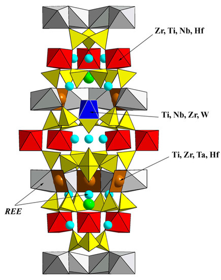 Eudialyte-group minerals (EGMs) are of significant scientific and industrial interest as important concentrators of RM and REM in agpaitic alkaline rocks [12,13,14]; therefore, these minerals are considered as important concentrators of rare elements (mainly Zr and REE) in agpaitic alkaline rocks and a potential source of REE, Zr, Hf, Nb, and Ta for industrial use [15,16,17,18,19,20,21,22,23,24,25,26]. EGMs are characterized by the following general crystal chemical formula: [N(1)3N(2)3N(3)3N(4)3N(5)3]{M(1)6M(2)3M(3)M(4)Z3(Si9O27–3x(OH)3x)2(Si3O9)2Ø0–6}X(1)X(2), where M(1) = VICa, VIMn2+, VIREE, VINa, VIFe2+; M(2) = IV,VFe2+, V,VIFe3+, V,VIMn2+, V,VINa, and IV,VZr; M(3) and M(4) = IVSi, VINb, VITi, and VIW6+; Z = VIZr, VITi; Ø = O, OH; N(1)–N(5) are extra-framework cations (Na, H3O+, K, Sr, Ln, Y Ba, Mn2+, Ca) or H2O; X(1) and X(2) are extra-framework water molecules, halide (Cl, F) and chalcogenide (S2−) anions, and anionic groups (CO32−, SO42−); x = 0–1; coordination numbers of key sites of the framework are indicated with Roman numerals [27,28,29]. Because of the complex microporous crystal structure of EGMs, the components are distributed between the different crystallographic sites (Figure 1), which has an influence on the search for the efficient schemes of the decomposing of EGMs and the extraction of RMs and REMs.
