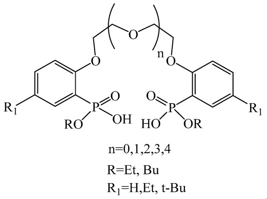 Earlier, we studied the extraction ability of phosphoryl podands, acidic semiethers of diphosphonic acids (Figure 2), with respect to actinides and lanthanides in nitric acid media [42,43,44,45,46,47].