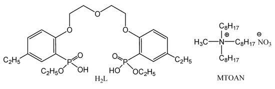 1,5-bis[2-(hydroxyethoxyphosphoryl)-4-ethylphenoxy]-3-oxapentane (Figure 3), synthesized according to the method described in [46], was used. The melting point as well as 1H and 31P NMR spectra were in good agreement with the literature data. 1,2-dichloroethane (chemically pure grade), tributyl phosphate (99.5%, Ekos-1), and methyl trioctylammonium nitrate (Sorbent-Tekhnologii OJSC) (Figure 3) were used. The absence of chloride ion in MTOAN was confirmed by the negative test with silver nitrate. Nitric acid (ultrahigh purity grade) and twice distilled water were also used. All solutions were prepared by the volume–weight method.