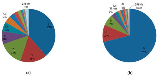 Herein, EGMs are silicates of sodium, calcium, and zirconium [15,30,31,32,33] which contain up to 2.5% of lanthanides [34]. Moreover, they are characterized by a high content of “heavy” yttrium subgroup metals. EGMs are widespread in mineral deposits of the Kola Peninsula [15] and contain, in addition to REMs, valuable zirconium and scandium, and also uranium and thorium. Moreover, EGMs are easily broken down by acids even without additional activation, which facilitates their processing [15,30,31,32,33].