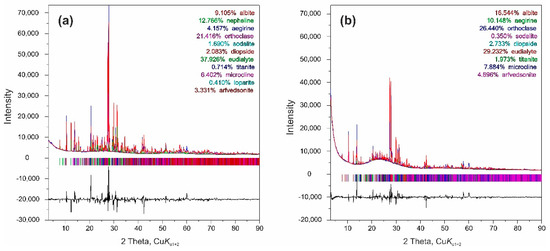 The obtained quantities for the minerals present in the eudialyte ore concentrate were (in wt.%): eudialyte—38, orthoclase—21.1, nepheline—12.8, albite—9.2, microcline—6.5, aegirine—4.2, amphibole—3.4, diopside—2, sodalite—1.7, titanite—0.7, and loparite—0.4. Visualization of the fit is given in a difference plot in Figure 6a. The obtained quantities for the minerals present in the eudialyte ore concentrate after breakdown were (in wt.%): eudialyte—29.6, orthoclase—26.7, albite—16.1, aegirine—10.2, microcline—7.7, amphibole—4.8, diopside—2.8, titanite—1.8, and sodalite—0.3. The powder X-ray analysis demonstrates that after leaching from the eudialyte concentrate, loparite and nepheline disappear, while the silicate part of nepheline becomes amorphous and forms a halo. The amount of eudialyte decreases to ~25 wt.%. According to the peaks, it seems that albite becomes less prevalent than potassium feldspars (microcline and orthoclase); however, this is not observed by the quantitative analysis. The reason for this is not so clear, probably because the albite peaks do not overlap with other minerals at 2θ = 27.9° (the same can be also observed at 2θ = 14°).