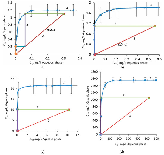 Figure 7 shows the extraction isotherms for U(VI), Th(IV), Hf(IV), and Zr(IV). For scandium and titanium, no extraction isotherms could be obtained under the described experimental conditions, as the ions of these metals are practically completely extracted. It should be pointed out that the use of the (R4N)2L ion pair in 1,2-dichloroethane as an extractant allows to concentrate uranium(VI) up to 1.2 mg/L. Accounting for the initial 0.5 mg/L content of uranium(VI) in the solution, more than four times more concentration is achieved as a result of several extraction contacts. A similar result is also achieved in the case of thorium(IV). The content of Th(IV) in the initial solution is 0.56 mg/L. According to the obtained isotherm, thorium is concentrated up to 1.77 mg/L after several contacts, i.e., approximately four times more, which is in good agreement with the goal of emanating uranium and thorium recovery and concentration.