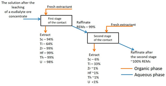 The loaded organic phase was directed for re-extraction with a solution of ~2 mol/L sulfuric acid, which leads to the destruction of the extracted complexes in the organic phase and the moving out of the extracted metal ions into an aqueous solution containing ~2 mol/L H2SO4. After re-extraction and additional washing, the reversed extractant can be returned to the extraction stage. Thus, it is possible to recycle the flows of organic and aqueous phases further to obtain concentrates of rare earth metals and emanated uranium and thorium together with zirconium, hafnium, and titanium.