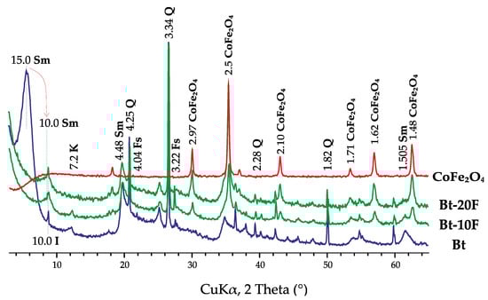 3.1. Characterization of Composition and Structure of CoFe2O4, Natural Aluminosilicate and Composites on Their Base