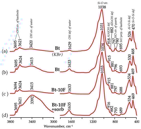 - Madejova, J.; Komadel, P. Baseline Studies Of The Clay Minerals Society Source Clays: Infrared Methods. Clays Clay Miner. 2001, 49, 410–432. [Google Scholar] [CrossRef]