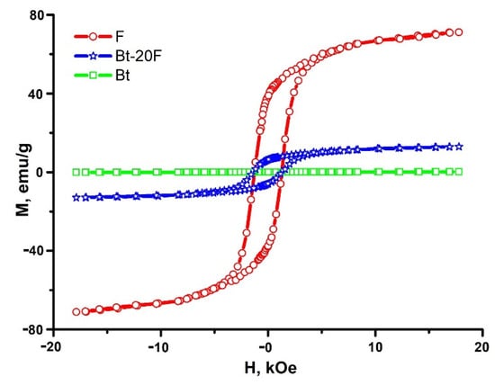 3.3. Magnetic Properties of Bentonite, CoFe2O4 Spinel and Composites on Their Base