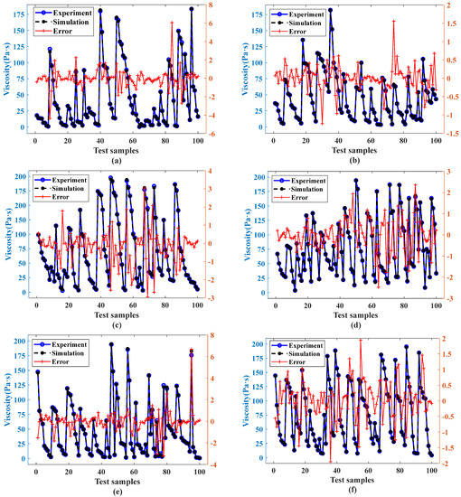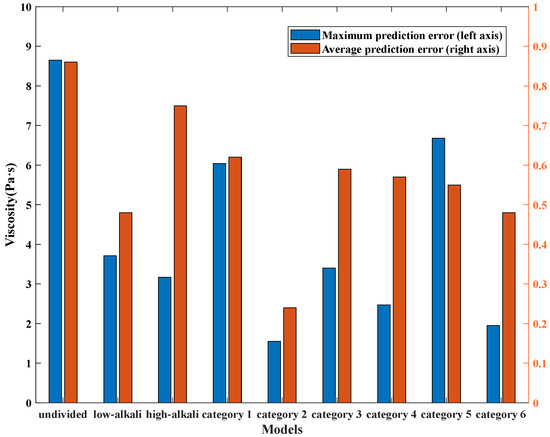 The errors in the predicted and experimental values of each model on the test set are shown in Figure 2. The randomly assigned test set contained data points with high viscosity values in the low-temperature region; nevertheless, the low viscosity values were in the high-temperature region. The ordinate of experimental value and the predicted value are on the left axis shown in Figure 2. Likewise, the ordinate of the error value is the right axis shown in Figure 2. The average predicted viscosity errors of the six categories of slag were 0.62, 0.24, 0.59, 0.57, 0.55, and 0.48 Pa·s. By dividing the slag using the competitive neural network, the BP neural network model developed based on the viscosity data in the second category had the highest prediction accuracy.