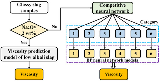 Whether categorized manually or by unsupervised learning, the slag viscosity prediction accuracy was higher compared to those that were undivided. In simple terms, the slag division and viscosity prediction methods with high accuracy are shown in Figure 4. First, manually determine whether the sample was low-alkali slag according to the mass percentage of Na2O in the component. For low-alkali slag samples, the viscosity values were obtained using the low-alkali slag viscosity prediction model. If the content of Na2O in the slag composition was greater than 2.00 wt%, then the slag was categorized by using the previously trained competitive neural network. The viscosity value was then calculated using the BP neural network model of the corresponding category.
