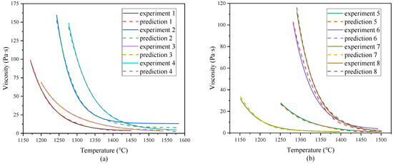 The predicted results of the slag viscosity are shown in Figure 5. Typically, larger errors occurred at low temperatures, for which the viscosity changes more rapidly with temperature. The predicted viscosity of the low-alkali slag in experiments 2 and 4 had a relatively large error at high temperature, and the values of SiO2 (wt%), S/A, and A/B of the sample were relatively low. Overall, the viscosity prediction error for the high-alkali slag was larger than that for the low-alkali slag, perhaps due to relatively few driving data. The viscosity–temperature curve for prediction 6 was relatively different from that of experiment 6. The SiO2 (wt%) and A/B ratio of this sample were 25.63 and 0.71, respectively, which were much lower than the other samples.