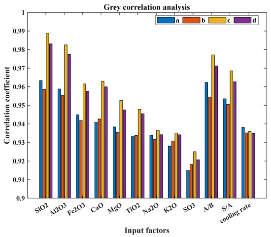 It can be seen from the grey relational analysis results shown in Figure 6 that the grey relational degree of each variable to the model parameters exceeds 0.9. The choice of input variables was reasonable and strongly related to model parameters. Overall, the top four input variables with the greatest influence on model parameters were SiO2 wt% > A/B wt% > Al2O3 wt% > S/A wt%, followed by CaO wt%, Fe2O3 wt%, MgO wt%, TiO2 wt%, cooling rate, and Na2O wt%. The two input variables with the least effect on the model parameters were K2O wt% and SO3 wt%.