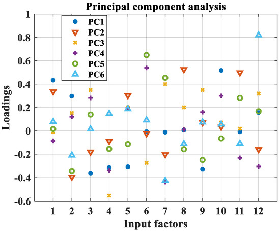 PCA was used to calculate the comprehensive evaluation value with p (p ≤ 12) principal components. Six principal components with eigenvalues greater than 1 were extracted using principal component analysis, and their cumulative contribution rate exceeded 82%, which well represented the entire sample. The normalized eigenvectors of the first six principal components, i.e., the corresponding loading, are displayed in Figure 7. The original input variables were combined with linear regression through the load number [17].
