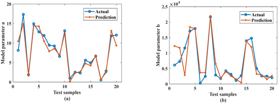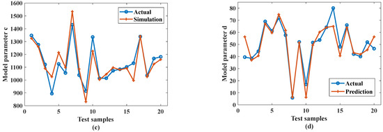 The validation and test sets each contained data for 20 samples, and the remaining 85 samples were training sets. After PCA processing, the input of the model was reduced from 12 to 6 by linear combination. After the test, the activation function for the second hidden layer of each model was determined to be tansig. The number of hidden neurons and the mean square error (MSE) for each model are shown in Table 4. Compared with the BP neural network, the prediction errors of the PCA–BP neural network for parameters a through d were reduced by 41.61%, 28.84%, 19.76%, and 3.74%, respectively. PCA could simplify the model input variables and reduce the redundant variables without losing crucial information, thereby improving prediction accuracy [18]. The PCA–BP neural network had better prediction results and potential for further optimization.