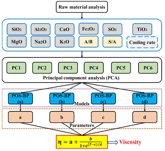 An empirical formula could directly draw the ideal type of viscosity–temperature curve [6]. Inspired by the empirical formula, the slag viscosity was a multivariate regression defined by a mathematical formula. The model parameters were determined by slag chemical components.